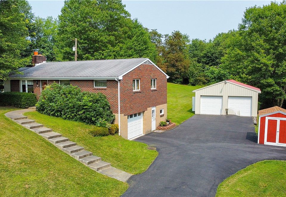 Lovingly maintained brick ranch on over six acres! This one level home offers a newer oak eat in kitchen, first floor family room w/ a propane heater and windows overlooking the land. Finished lower level game room. This fine home is a mechanics dream w/ a four car detached 38x29 garage complete with car lift and loft, as well another 31x24 detached garage. A shed for garden storage is also featured. Paved driveways. This home could be used for horses, farming, pasture and fields. A car or horse enthusiast's dream come true!