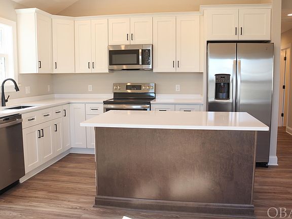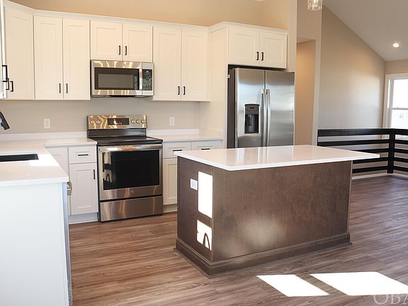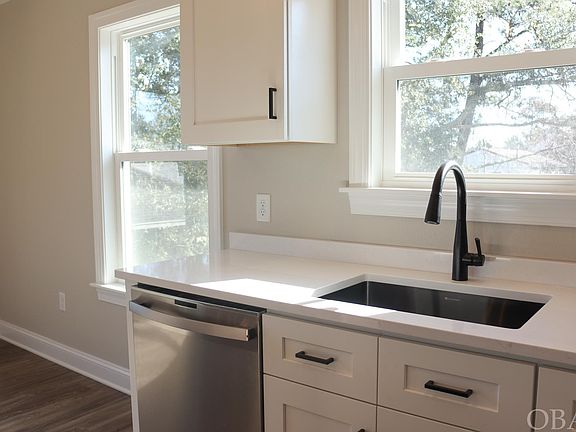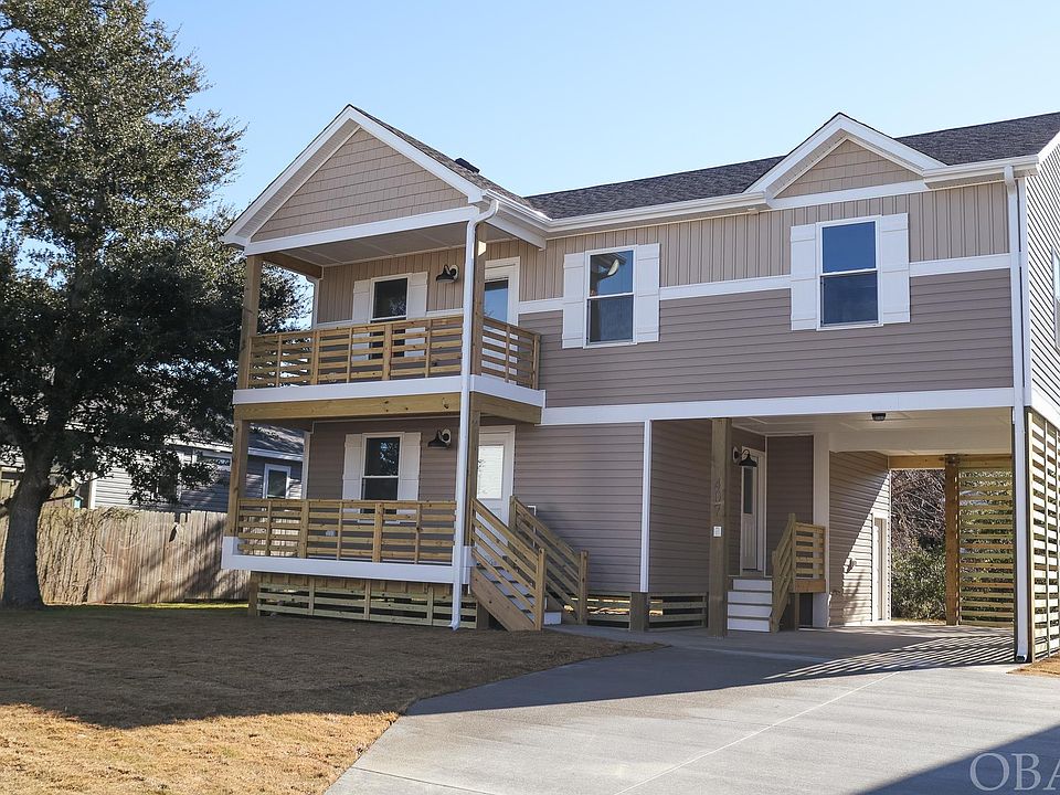 Beautifully built new construction in the heart of Kill Devil Hills! This home offers a spacious layout with 3 bedrooms, 3 bathrooms and two living rooms. Inside the home the two stories can be separated by a door to provide privacy between the two levels. The primary bedroom is located on the second floor and has a large bathroom complete with a custom tile shower with sliding glass door and a two sink quartz vanity. Also on the second level is a second bedroom and bathroom, living room, kitchen and dining area. The first floor has an additional living area, wet bar, the third bedroom and bathroom. The first floor has two mini splits to allow for separate temperature controls from the second floor. The home has quartz countertops throughout, stainless steel GE appliances in the kitchen and includes GE washer and dryer on the second floor. There are two front porches perfect for relaxing and a large storage room under the carport. The yard is finished with sod and the concrete drive is wide enough for two vehicles to park. 407 W Palmetto Street is located right off of Bay Drive which offers an excellent walking/ biking path along Kitty Hawk Bay. This home is located close to grocery stores, restaurants, and shops. And is only a 2 minute drive to the beach!