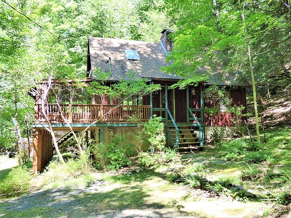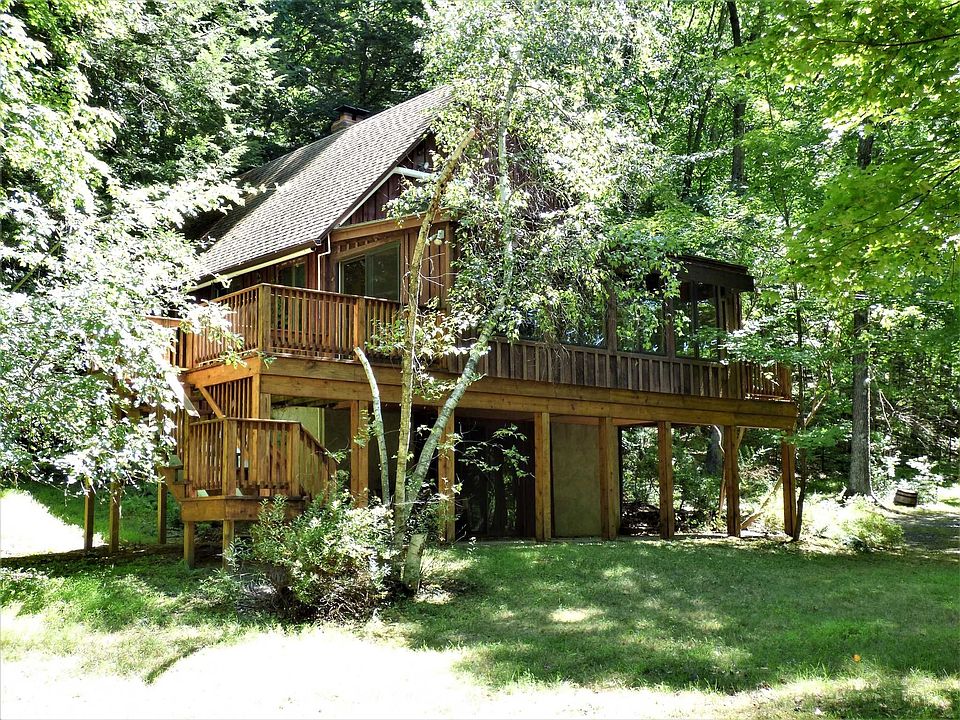 Privacy abounds, up a long driveway tucked into the landscape is an Adorable A-Frame with a private Pond & dock. 2 Bedrooms plus loft, open living area with kitchen, glassed sunroom with Radiant Heat, porch, deck & patio on a combined 13+ acre (2) parcel lot. don't care to see anyone, you won't.