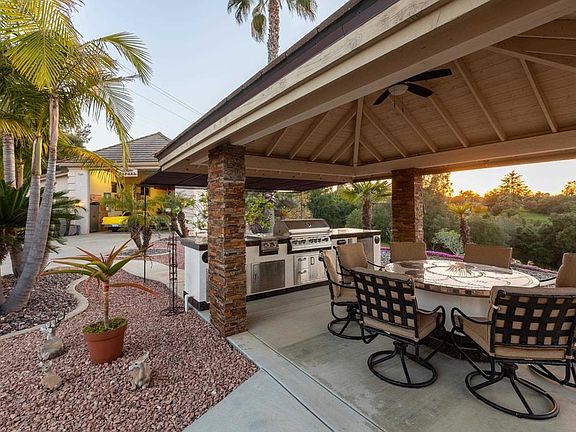 Recent Price-Improvement on this stunning single-story retreat with million dollar views and expansive car barn! From the moment you drive through the main security gate, you'll appreciate the privacy, elegance and attention to detail of this custom-built home. Nestled on a tranquil hilltop, this stunning Fallbrook estate offers 260-degree views of the most breathtaking mountain caps stretching from San Gorgonio to Palomar Observatory. The impressive 3,257-square-foot estate sits atop a sprawling 2.99-acre lot and boasts an expansive car barn/RV Garage that's perfect for car collectors. Outside, the wraparound patio offers the best views that Fallbrook has to offer, showcasing different viewpoints with multiple alumawood pergolas and awnings. You can entertain guests here while cooking up a feast on the outdoor kitchen's built-in barbecue area with sink, warming drawer, mini fridge, and gas fire-lit dining table. The enchanting landscape is home to mature fruit trees of fig, tangerines, oranges, grapefruits, pink grapefruits, apricots, peaches, pomelo, and more. You'll also love the seasonal creek, 12’x12’ treehouse with carpeting and generator hookups, tire swing, and beautiful pink and purple blooming ground cover with jasmine sprinkled in. A car collector's dream featuring an oversized attached 4-car garage with ultra-impressive black and white porcelain tile, storage and glass door display cabinets and sink. The detached steel-built RV garage measures 17' x 22', is finished and can comfortably fit 4 cars, with a hoist lift (negotiable) and an additional pull-through garage that's attached. Enter the home through the double front doors and be greeted by the dynamic foyer looking onto the formal living room, which features a wall of windows showcasing the views. You'll appreciate the open-concept and flowing floor plan with many upgrades throughout the home, including crown molding, impressive archways, dynamic tray ceilings, surround sound, plantation shutters, custom window treatments, and fire sprinklers. Retreat to the luxurious primary suite that occupies its own wing of the home, ensuring privacy and tranquility. The bright and open space is flooded with natural light through glass patio doors that lead out to a private patio with stunning views. You can cozy up by the gas fireplace with granite stone, encased by an elegant white mantle complete with display shelves on each side. The sitting area provides a perfect spot for relaxation, while beautiful tray ceilings and surround sound enhance the ambience of the room. The ensuite bathroom is renovated with new vessel sinks and vanity mirror, a jacuzzi tub, oversized shower, and walk-in closet with built-ins and a center island dresser with a granite top. Chef's dream kitchen is complete with top-of-the-line features and finishes. The white Cambria Quartz countertops and stone backsplash complement the stylish white cabinetry, which features under-cabinet lighting and a built-in desk area with beautiful display cabinets. The spacious center island provides ample room for food preparation and includes a bar area for casual dining. The kitchen is equipped with a charming farmhouse sink, stainless steel KitchenAid appliances, including a built-in refrigerator, trash compactor, and double ovens. The kitchen opens up to a cozy breakfast nook and a family room, warmed by a beautiful granite fireplace and complemented by built-in cabinets and double glass doors that lead to the viewing deck. Three additional bedrooms with two bathrooms are located in their own guest wing of the home, ensuring privacy for both you and your guests. There's also a spacious office off the garage that could serve as a fifth bedroom, and a large laundry room with plenty of storage cabinets, a desk or sewing area and a sink. The property has been cleverly developed to maximize the incredible views and land, creating a truly unique and inspiring living experience.