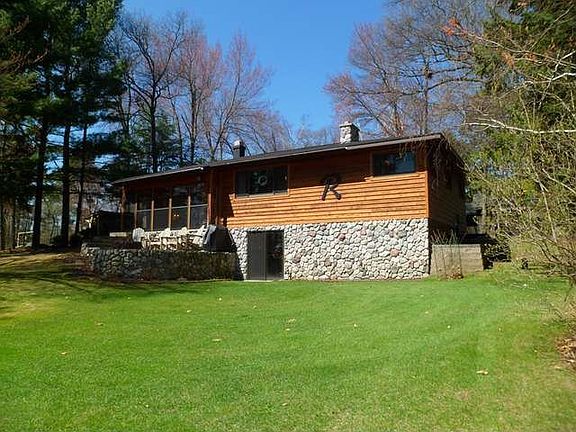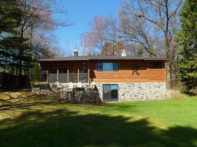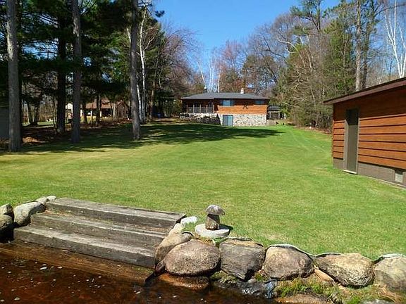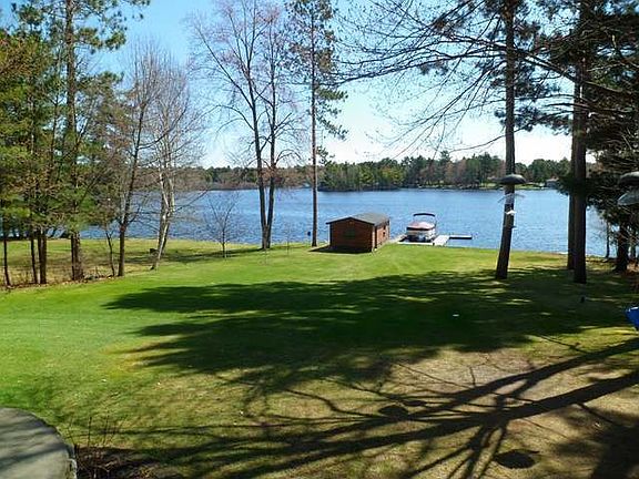 LAMBELE LANE HOME - A gorgeous 1+ acre lot sets the stage for this cedar & stone "Up North" retreat. A long driveway studded with towering trees leads you to this 3BR/2BA meticulously maintained home on the Rhinelander Chain. A gentle slope to the lake is your pathway to hard bottom sand frontage and absolutely spectacular views. Location is key, as it is only 1 mile outside Rhinelander. There is warm knotty pine ambience, charming kitchen w/new countertops and large walk in pantry, 2 wood-burning fireplaces, lakeside screen porch, and an elevated firepit (the best seat in the house). Boathouse at water's edge has an electric winch and will conveniently shelter your boat from the elements. Rip rap shoreline, in-ground irrigation, 2 car garage, large shed, blacktop driveway and so much more! This property can be your Northwoods refuge on a sprawling lake chain, offering exceptional fishing. This one of a kind property is on one of the best lots on the Rhinelander Chain!