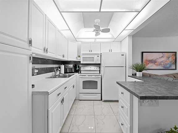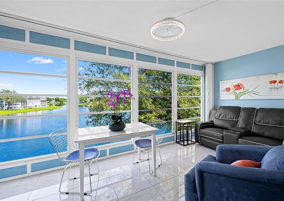 STUNNING WATERFRONT CONDO – FULLY UPDATED 1BR/1.5BA WITH INCREDIBLE VIEWS! Beautifully updated 4th-floor 1-bedroom, 1.5-bath condo with expansive water views in the sought-after Century Village 55+ community. This unit features a modern open-concept kitchen with wood cabinetry, tiled backsplash, and newer appliances. Tile flooring throughout, updated A/C and water heater, and stylish new furnishings included. Spacious enclosed patio offers a perfect space to relax or entertain while overlooking the serene water. Located in a well-maintained building just steps from the clubhouse. Enjoy resort-style living with amenities including a clubhouse, heated pools, tennis courts, billiards room, fitness center, and complimentary bus service. Conveniently close to beaches, shopping, and restaurants.