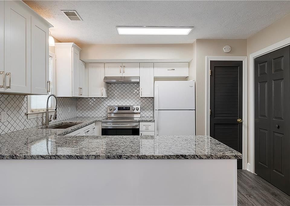 ALL NEW EVERYTHING, SHOWS LIKE A MODEL! New kitchen with soft close custom white cabinets, polished granite countertops, oversized custom sink with pull-out sprayer, ornate tile backsplash & new appliances. New HVAC, luxury vinyl flooring throughout, elegant light fixtures, new outlets/switches & new paint top to bottom. Both full baths have custom subway tile, one tub & one shower, new lighting & all new custom vanities with granite tops. Spacious living room is flanked by wood burning brick fireplace with custom mantle. Main level leads out to patio and private grassy backyard. Two assigned parking spaces. Additional storage space. Cul-de-sac location, park like quiet setting. Excellent investment opportunity and/or your new home! HOA fee covers water, exterior maintenance, roof, parking and landscape. Close to schools, shopping, Hwy 53 & 60. Owner is the listing agent.