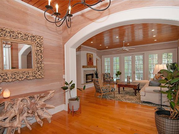 Distinctive coastal home offers incomparable ownership within the Oceanside section of Prince George. A historical and pristine tract of 1900 acres, Prince George offers only 150 unique single-family home sites stretching from the Atlantic Ocean to the Waccamaw River. This immaculate two-story, 4-bedroom, 4-bath raised-beach home on 2.24 acres of woodland boasts private pool, lake views and easy proximity to beach access. Interior architectural details include pine plank ceilings, oak floors, arched access ways, whitewashed shiplap, custom cabinetry, built-in shelves and more. Beautifully updated eat-in gourmet kitchen features quartz counters, built-in dual ovens, induction cook top, central work island, wet bar and walk-in pantry/laundry room. The great room and open dining area share a double-sided wood-burning fireplace as well as French doors leading to the screened porch. The entire top floor has a spacious, open-concept master suite boasting abundant natural light and private tree-top views. Three more bedrooms and bathrooms are located on the main floor. All four baths recently renovated. Newly installed 15 x 30 outdoor saltwater pool and spa boasts cobblestone patio surround with in-pool tanning ledge and private setting. Outdoor shower house with changing room. Side-loading garage under house. Elevator is possible with pre-built shaft in place. 2022 HVAC. Full list of recent improvements is available. Prince George boasts unspoiled natural beauty and ample amenities. The Oceanside clubhouse boasts tons of charm with fireplace, kitchen, slate floors and cathedral ceiling. Adjacent to the clubhouse is a swimming pool with shade cabanas, playground and ball courts (tennis, volleyball, basketball). Residents have private beach access and can enjoy daily walks on miles of nature trails. Relax within the embrace of ancient oaks and cypress at the charming Riverside clubhouse with fireplace located along a boardwalk leading to the private day dock.