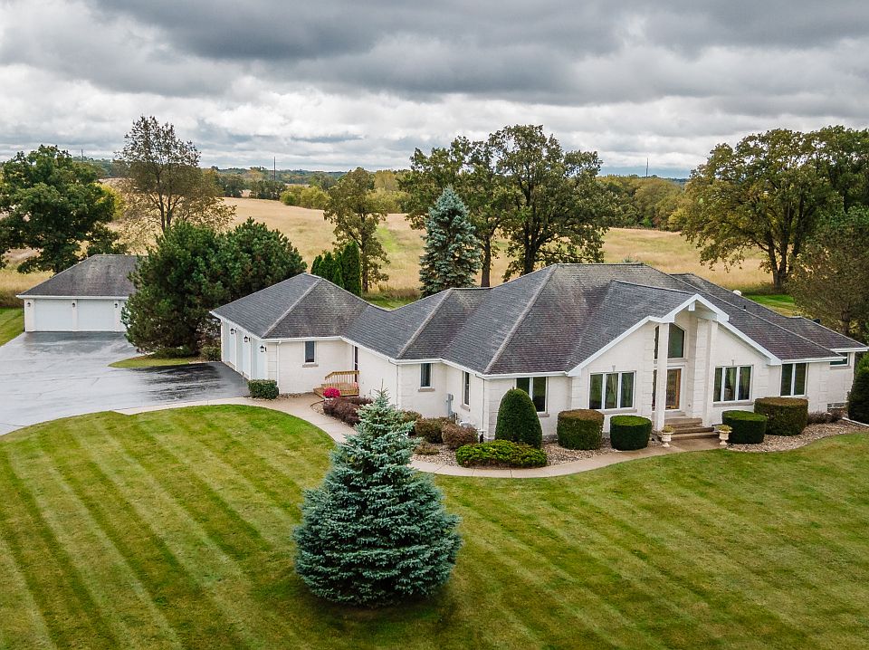 Come view this magnificent executive ranch. This home has sprawling entertainment spaces that flow inside & out. The outdoor pool with trex decking affords views of lush landscape. The impressive entrance greets you with beautiful marble flooring, elegant pillars, large windows bringing the outdoors in & an attractive fireplace to enjoy in the open concept family, living & dining rooms. The impressive art on the trey ceilings in living & dining rooms exude sophistication. The meticulous appointed updated kitchen is truly a chef's delight featuring high-end stainless-steel appliances, tasteful copper tiling backsplash, & beverage center. Large master bedroom with master bath spa like en suite & a huge walk in closet. 4 Car Detached Garage! Easy commute to Chicago or Milwaukee from Hwy 50.