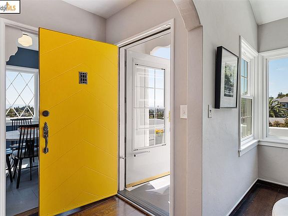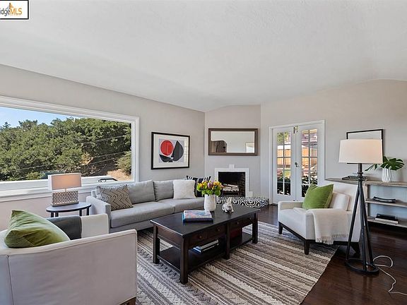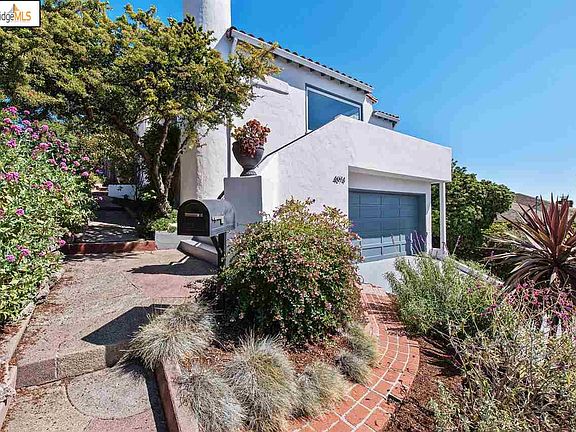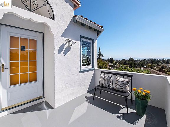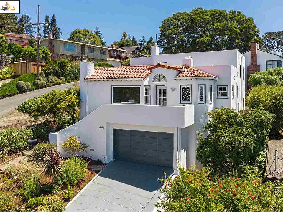Spanish Revival, Panoramic Bay View home on lovely Redwood Heights street. Stucco, tile roof, stunning gardens, fantastic outdoor spaces. Backyard: pavers, gravel pads, sunset deck! Entry: hall closet, arched doors. Living room: curved ceiling, view window, fireplace, hardwood floors. Dining room stars a Moorish staircase w/spiral ironwork, French doors to pergola patio, bar open to kitchen. Updated kitchen preserves vintage trim, Bay view windows, open shelves, composite stone counters, s/s appliances. Breakfast turret: Bay views, 2 hutches w/glass-front cabinets. Lower levels (master br/suite potential): family room, cocktail bar, patio doors. Laundry, half-bath, stairs down to shop, storage, possible wine cellar, big garage w/interior access. Upstairs: two bedrooms, multiple closets, balcony, office nook. Full Bath keeps vintage black/pink tile & fixtures, vanity sink, streamline tub, detached shower. Minutes to Hwys 13 & 580, Laurel shopping, walks, parks, hikes. Redwood Hts Elem!