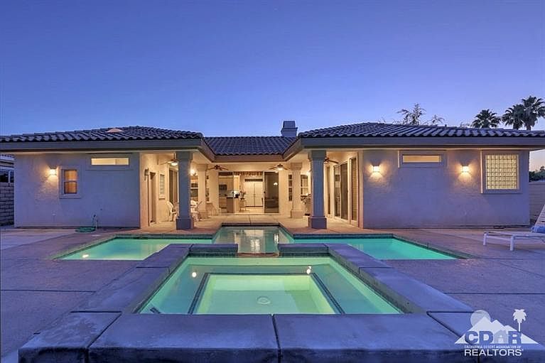 Turnkey furnished 3 Br, 3 Ba, sleeps 7 with WiFi. This lovely Custom home was built for comfort & privacy in upscale Palm Desert close to shopping & dining. The 2 King master bedrooms are on opposite sides of home with 12 foot sliding doors leading to magnificent, lap pool/spa area. Both have large baths en suite, one with Spa Tub/Shower and the other with Glass block shower. Each master bedroom has walk-in closets and HDTV. 3rd guest bedroom has TV, a trundle bed (sleeps 2) and a Futon. Great Room was designed around a unique 3-sided fireplace. It provides wonderful entertainment for all with it's flat screen HDTV/DVR/DVD. You will love the huge wet bar & casual dining area facing the Gourmet kitchen. U-shaped Patio with 4 fans and outside dining. Lap Pool/Spa with brick Pergola area for relaxing and have child friendly steps and wading pool. Excellent School District. Owner may consider $3200 per mo + Utilities for 12 mo. lease.