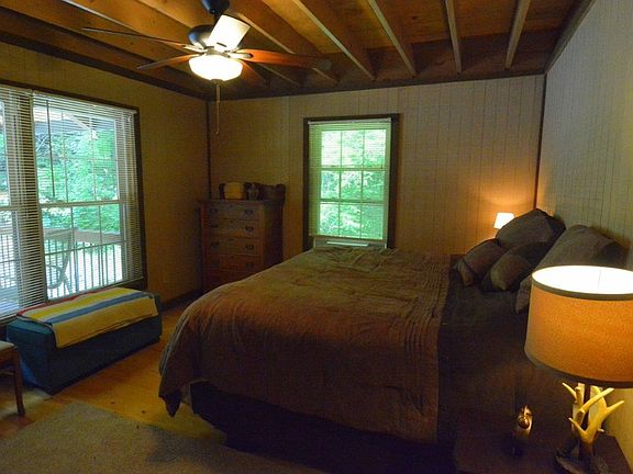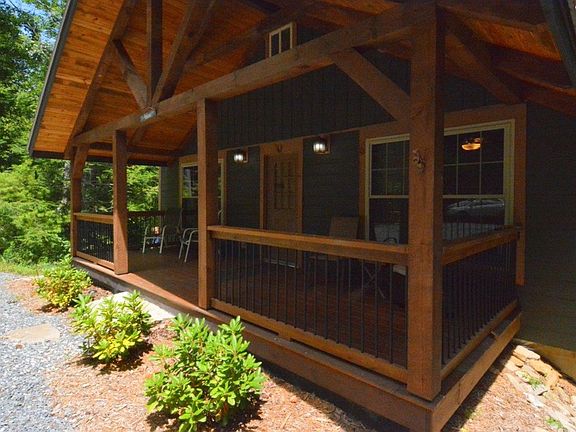 Quiet location near Fontana Lake, just off of NC 28, this Arts and Crafts style home is easy, one-level living with a focus on the outdoors. The timeless appeal of this open floor plan will resonate with young and old. With a large covered porch in the front and spacious deck in the rear, the great room, kitchen and dining area are all open to the wall of windows allowing for plenty of natural light. There are two comfortable bedrooms with a well appointed bathroom as well. Lovely hardwoods, modern fixtures, energy saving features, unfinished basement garage with doors and exposed beams are just some of the benefits to this home.
