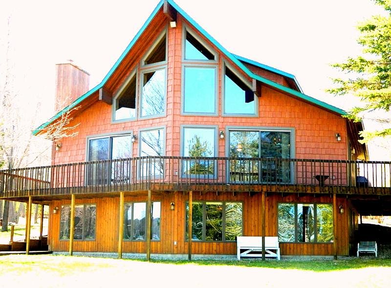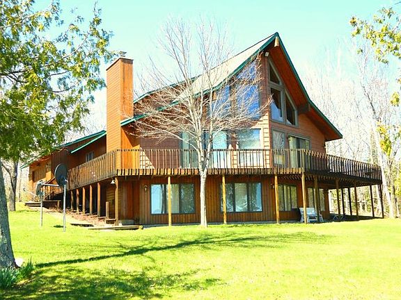 Custom built chalet nestled in wooded 100' x 900' lot, 4 bedrooms, and 3 baths. Kitchen has granite counters, ceramic flooring, and a decorative wood panel ceiling. Living and dining room has full view from the door walls that lead to the wrap around deck. Living area has fieldstone fireplace with wood insert and a wet bar with tongue and groove on walls and cathedral ceiling. Upstairs is a master suite, bath with a Jacuzzi tub with shower, a walk in closet, and a 5' x 12' balcony. Walkout finished lower level has spacious family room, large window for a view of the lake, and a wood stove mounted on ceramic with back wall of fieldstone. The lower level has in floor heat. 30' x 40' detached storage building. A must see to appreciate Quality workmanship.