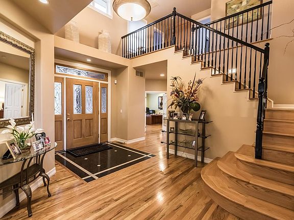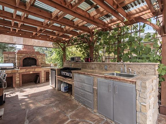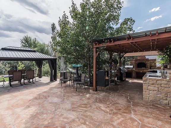 Incredible home on quiet and private, treed lot! Hardwood floors throughout most of the main and upper levels! Dramatic 2-story entry with marble tile inlays. Large private office with french doors. Spacious main floor master suite accesses private side patio and yard! The 5-piece master bath includes his and her sinks; walk-in closet with window; jetted tub; plantation shutters and private shower with seat. Entertaining in this beautiful home will be a delight with its vaulted great room; gourmet kitchen and formal dining room. That's not all...step out onto the flag stone patio and into the covered "Grill Master" outdoor kitchen complete with granite counters; large sink; refrigerator; gas grill and brick grill perfect for pizza night!! The yard also includes apple trees, pear trees and grape vines! Three bedrooms are located on the upper level each with a bathroom; 2 share a Jack-N-Jill bath and the 3rd is a private suite with its own 3/4 bath.