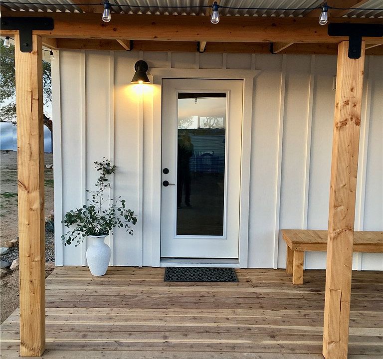 Welcome to Avalon Mesa, a beautifully re-imagined California desert bungalow on five acres in the prime Yucca Mesa neighborhood of Yucca Valley! This is essentially a brand-new home with a fully permitted remodel including a new roof, windows, siding, drywall, electrical, plumbing, tile, and fixtures. Enclosed behind a circular driveway, surrounded by a high-end galvanized metal fence with a motorized redwood gate, enter into a 4,000 square-foot private park-like setting with new succulent and native plantings and mature pine, eucalyptus, willow, and Joshua trees. A rock-lined path leads you to the front door protected by a charming pioneer-style covered porch. Step inside a quiet, peaceful interior and into the large eat-in kitchen with hand-finished wood cabinets, honed white concrete counters, professional-grade appliances, and a custom-built red oak dining table — finally a real kitchen in the desert! The kitchen flows into an open-concept cozy living room with a wood-burning stove and wonderfully curated new and designer vintage furniture pieces. The adjacent bonus room/office has double walk-in closets and French doors that lead out onto a gorgeous redwood deck with views of the surrounding Joshua Trees — perfect for stargazing, dining al fresco, or enjoying time by the fire. Down the hallway, find an indoor laundry/utility room, a nicely proportioned bathroom, and the main cozy bedroom with a generous closet. Conveniently located equidistant to the trendy shops, restaurants, and attractions of Joshua Tree, Yucca Valley, Flamingo Heights, and Landers, experience the ease of shorter travel and commute times with paved access along Avalon Ave. The rear portion of the lot has frontage along Mesa Dr., creating an excellent future development opportunity. Views of the open land and abundant surrounding Joshua Trees make this a special location with wide-open spaces in every direction. All furniture, rugs, and decor are included in the sale, adding to the affordable luxury. This turnkey property stands out from the crowd and is calling you to call it home.