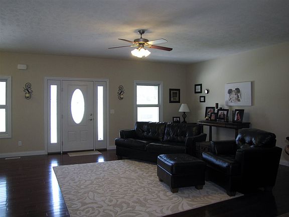 Stop the car! Here is the home of your dreams! Happiness begins in this remarkable ranch with full walkout basement, 38 x 50 Pole barn with 2.25 acres and country location. Desirable open floor plan features a beautiful 1 story 3 bedroom 2 bath home with 1800 SF and split bedroom floor plan. Gorgeous kitchen is styled with castled cabinetry, solid surface countertops, Frigidaire Gallery stainless appliances and breakfast bar. Open great room with 9' ceilings and hardwood or tile throughout the main floor. The master suite contains all the amenities of a modern home including 2 closets, a full bath with 2 sinks at back saver height, walk in shower, and linen closet. Other 2 bedrooms offer privacy on the opposite side of the home and share a full hall bath. Off the attached 2.5 car garage is a convenient laundry room with cabinets and a vanity sink. The full 12" poured wall basement with walkout patio and 9' ceiling has an office but is mostly unfinished. A magnificent 38 x 56 pole barn has it all including floor drains, a full 3rd bath, kitchenette and is partly dry walled. Attractive brick with colored mortar, front porch and covered back deck adds to this amazing homes appeal. Impressive views of the 2.25 acres offer a tree lined backyard with privacy and country setting.