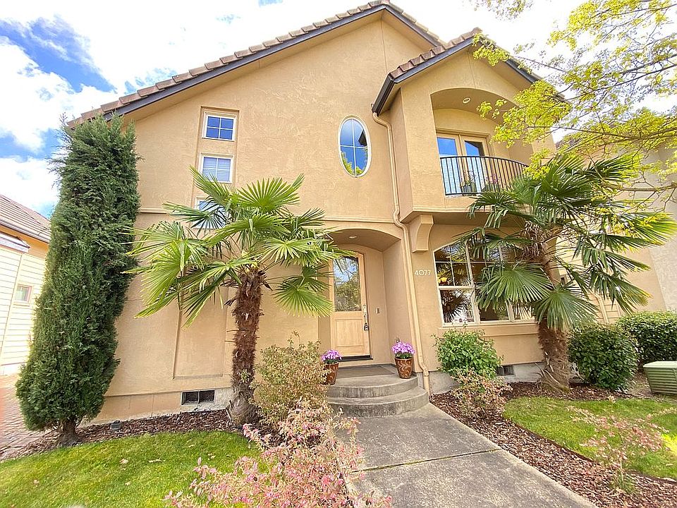 This is an elegant home in a walkable European-style neighborhood of high-end homes. A light and spacious design by Arbor South Architects. Vaulted ceilings, open plan, and gourmet kitchen. Large bedroom suite with custom stone tile walk-in shower, double vanity, walk-in closet. Second bedroom would make a great office with vaulted ceiling and french doors to an exterior balcony. A beautiful wrought iron stair rail frames the interior balcony. So many custom touches: Brazilian cherry wood floors, 8 and 7 ft doors, gas fireplace, granite counters, custom cabinetry, stainless steel appliances, laundry room with sink, hand-finished plaster walls, stone tile bathroom floors and counters (slate, travertine), built-ins in all closets. 3 bedrooms (upstairs), 2.5 baths, plus a nook perfect for additional office or hobby space. Stucco exterior w/ tile roof, shared earth-friendly paver driveway, finished 2-car garage, private courtyard with covered patio, small easy-care yard, evergreen blueberry plants in front yard, underground sprinklers on timer, potential to fence a small side yard for pet, etc., and school nearby with access to recreation fields (dog walking, excercising) and playground. New water heater, structured wiring throughout. Builder said it's wired for a TV above the fireplace (never used). 4J schools. Thoughtfully designed with high-end finishes. NOT a townhome -- no HOA! HouseInEugene@gmail.com