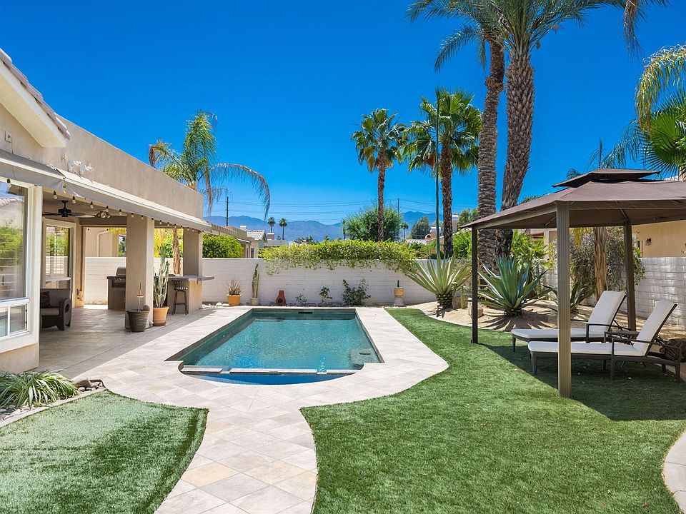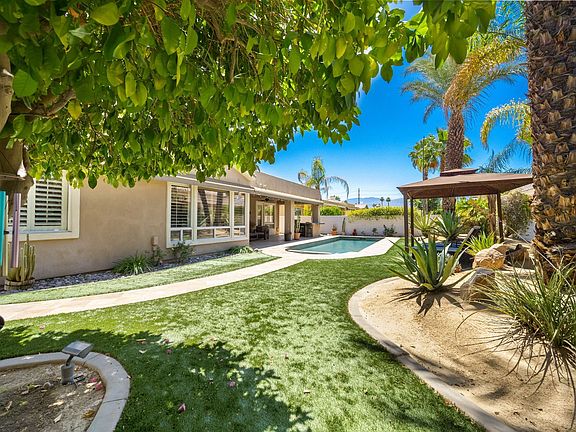 Welcome to Shangri-La! This stunning home features the ultimate in outdoor entertaining. An extensive loggia complete with misting system, retractable awnings, built in BBQ island, cook top, fridge are perfect to host movie nites or watch the games! Enjoy a libation or two from your cabana and a refreshing dip in your saltwater pebble tec pool/spa. A most beautiful backyard meticulously manicured with tiled decking and mountain views.This energy efficient home will save you $$ with an owned solar panel system plus NO HOA dues! Dual A/C units, newer water heater, 8 ceiling fans, 5 skylites, plantation shutters, retractable door screens to name a few features.The fabulous open floor plan offers 2753' of living space and includes its own detached private casita with bed/living room, bath and wet bar with fridge and microwave. Past the gated entry thru double doors a massive great room with 3 way fireplace opens to the view of the loggia and outdoors. The kitchen boasts dual granite counter islands, stainless appliances, double ovens, and extensive storage. Two master suites with en-suite baths, walk in closets, a separate 1/2 bath in hallway and an office/ den with built-ins. Separate dining room and laundry room. 2 car garage PLUS golf cart garage/storage/ personal gym.This home is situated in a prime Palm Desert location on a quiet and private cul-de-sac and ready for your most discriminating buyer. Also offered furnished per inventory for your convenience!