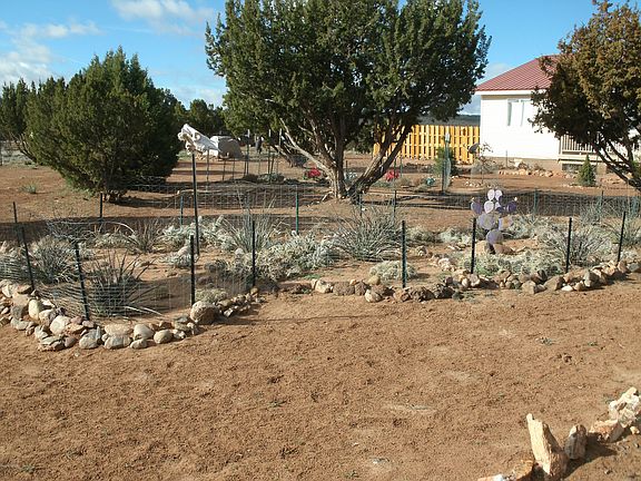 Home with an extra large garage and lots of storage. There are 3 covered decks and a stone patio that is enclosed for privacy. There is a horse corral with a protected enclosure and a hay storage area. Enjoy a lovely view of mountains surrounding the property. It has been landscaped with plants that grow well in the area. The property is fully fenced with 4 inch wrapped wire fencing. Area is quiet and enjoyable. Owner is a Licensed Real Estate agent in Arizona. It is my home.