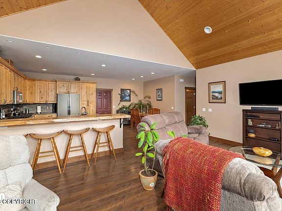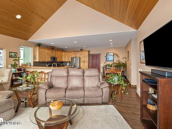 Imagine your own private spot overlooking Kachemak Bay. A long meandering driveway, mature spruce, spring/summer gardens, a custom 2 bedroom upper level and a partially complete lower level full of possibilities for separate living space, or a perfect crafts or hobby area. An open free flowing floor plan upstairs has a warm and cozy living room, meticulously planned kitchen, & spacious masterThis home has just been really well designed. Privacy is ensured by nestling access along a tree-lined drive to 2.5 acres homesite. Once inside the home, you'll notice true craftsmanship throughout the main level. The kitchen features knotty pine cabinets, white pine island bar, a gas range, and plenty of storage. The open floor plan creates a seamless connection to the living room, where you can unwind next to a wood stove and enjoy the big window wall that showcases the sheltered view to Kachemak Bay. Just down the hall is a bedroom to the left and a full bath to the right. This is perfect setup for an office or guests. The master with the private ensuite full bath is on the south side of the home. What a great way to greet the day with windows inviting in the sunrise and light. The total square footage reflects both the finished area upstairs (1268 sq ft) and the partially finished area downstairs (1268 sq ft). Access to the lower level is through the garage. This maximizes the opportunity to have that space be a private getaway, studio or expanded guest area. There is a cistern in the lower area but it has not been hooked up. The Seller thoughtfully added the cistern in the event there was ever a problem with the well. To date, the well has provided all of the water necessary to run the home and the gardens. Speaking of gardens-the outdoor space is a perfect combination of mature spruce, fields of wildflowers, established flower beds and raised gardens. This is a home that offers both serene indoor and outdoor spaces plus easy access to ski trails, hiking and a quick drive to town. In fact you can ski straight from the lower level of the house to Sunset loop ski trail. What would be better than that?