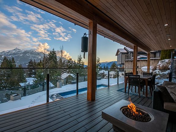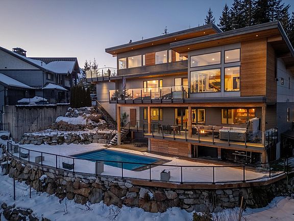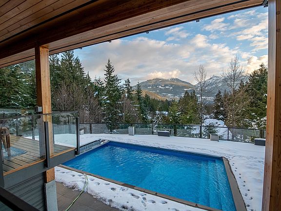 ONE OF A KIND - Magnificent home in Stonehaven, at the TOP of Squamish!! Offering panoramic, breathtaking views of Howe Sound, the Chief and all of the surrounding mountain ranges. This 4,125 sq. ft. masterpiece features an open-concept design with timber beams, vaulted ceilings, and 16x12 glass sliding doors for seamless indoor-outdoor living. The kitchen boasts a 48" SMEG Italian gas range, Sub-Zero fridge, and quartz waterfall island specialized for Chefs. Five bedrooms, with an extra office, laundry room, media room, & wet bar provide ultimate versatility. Enjoy 1,200+ sq. ft. of deck space, a salt water, heated swimming pool with an automatic cover, a high-efficiency heat pump, A/C, LED lighting, and brand new solar panels—all in a prime location near trails, parks, and amenities.