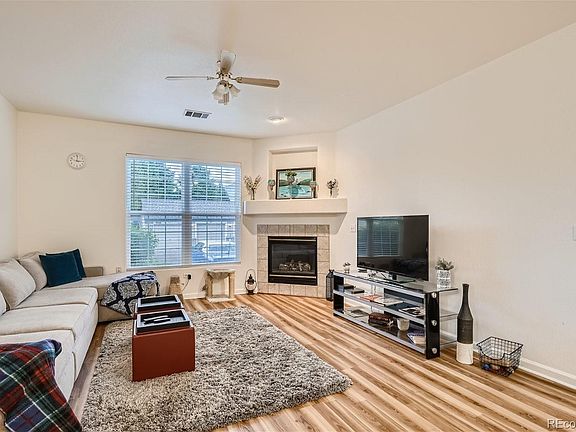 Welcome to this bright, GROUND LEVEL, END UNIT, 2 bed, 2 bath condo in Meadow Hills. Enjoy the low maintenance with laminate floors throughout. The open floorplan has a spacious family room with gas fireplace adjacent to the kitchen and dining area. The primary bedoom has 2 closets (one walk-in and one standard) leading into the full primary bath. The guest bedroom is just down the hall with close access to the 3/4 bath. The laundry is complete with washer and dryer. This unit has a detached single car garage, however, it is “use-only” as noted in the legal description. Close to Cherry Creek State Park, I-225, Parker Road, DTC and is part of the Cherry Creek School District.