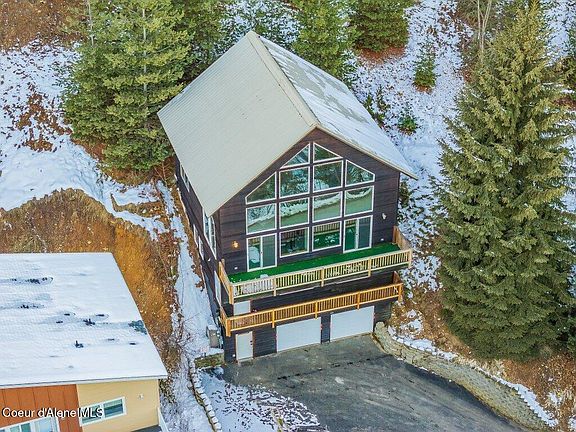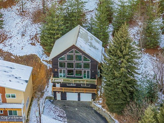 Nestled above the charming town of Kellogg, this beautifully appointed multi-story chalet-style home offers sweeping views of the area and surrounding mountains. Also included are two neighboring vacant lots with development potential. Huge added value. With 4 spacious bedrooms, 3 full baths, and multiple living areas, this home is designed for both comfort and functionality. Featuring two gas fireplaces, a loft, a second kitchenette and dinning area, it is ideally suited for its current use as a highly successful vacation rental. Extensive decking and large windows create an inviting atmosphere, providing the perfect setting for enjoying the four season scenery. The vaulted ceilings and two cozy fireplaces add a sense of grandeur and warmth. The open-concept great room is perfect for entertaining, and the interior balconies and a spiral staircase enhance the home's unique character. Recent upgrades include two new furnaces, a new A/C unit and two new hot water heaters. The property is being sold fully furnished and is currently operating as a popular short-term vacation rental. In addition to the main home, two neighboring vacant lots to the north are included in the sale, offering potential for development or increased privacy. The exceptional property combines stunning views, a well thought out layout, and tremendous potential, making it a rare find with many possibilities. Close to skiing at Silver Mountain Resort, and biking along the trail of the Coeur d'Alene's. Also within walking distance to downtown restaurants and shops.