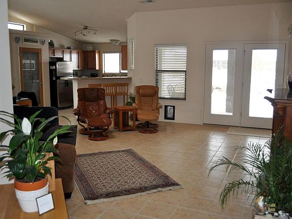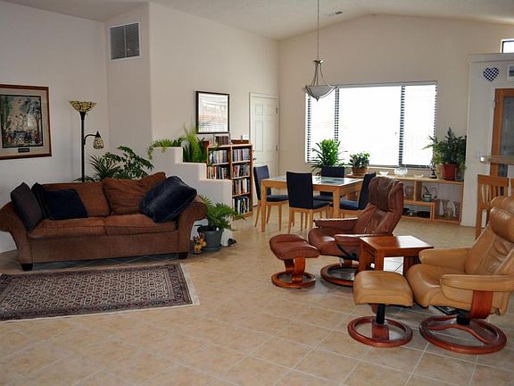 Fabulous home on a fenced and landscaped .5 acre lot. Open floor plan, skylights, cathedral ceiling,upgraded lights and fans throughout, 3 bdrms plus an office, over-sized garage. Kitchen has Stainless Steel appliances, pantry and pull-out shelves. Large master bedroom and bathroom features double sinks, soaking tub and shower(no step, high & low shower heads). Enjoy mountain views and a flowing waterfall from your backyard patio and beautiful NM sunsets from your front courtyard. This home is truly a wheelchair/handicap friendly plan with no-step entry, wider doors and turning areas. Call for additional details.