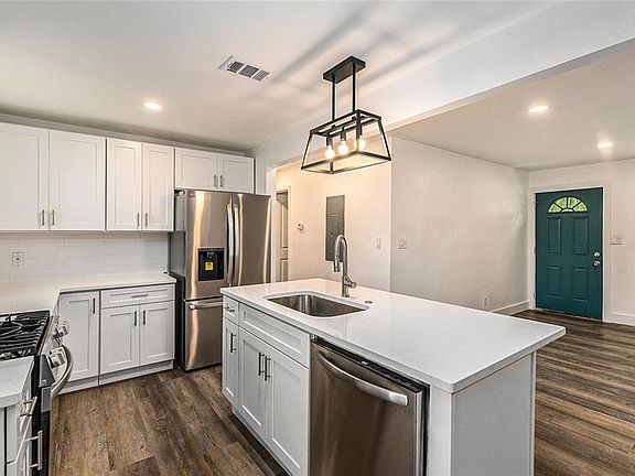 Open light-filled floor planBrand-new stainless steel appliancesDesigner light fixturesNeutral plank flooringQuartz countertopsSpacious modern kitchenNewly poured driveway