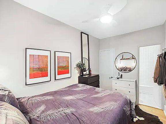 The queen-sized bedroom offers generous closet space, making it as functional as it is inviting.