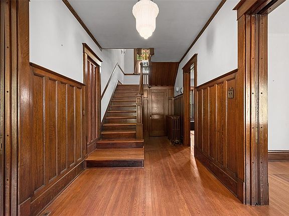 As you step through the grand entrance, via double doors, you're greeted by the spacious interior adorned with original stained glass windows that cast colorful patterns across the original hardwood floors. The main level offers a seamless flow between the living room, dining area , kitchen and full bath creating an ideal space for entertaining guests or simply relaxing in the warmth of natural light.