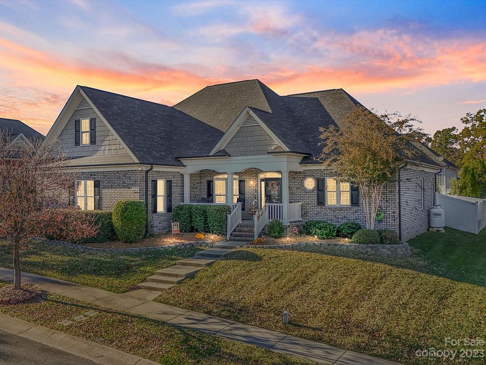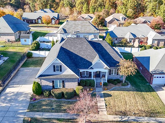 This open concept full brick home located in The Meadows offers a desirable split floor plan with three bedrooms and two full baths on the main level and a spacious bonus on the upper level. The main living areas and bedrooms offer engineered hardwood flooring. The great room with vaulted ceiling includes a fireplace and opens to the dining room, breakfast area and kitchen. The primary bedroom and dining room have tray ceilings and bathrooms boast granite counters. The kitchen has Eudy's custom cabinets and 2022 installed stainless steel appliances, granite counters and tile backsplash. The laundry room has cabinet storage and a utility sink. Relax on the covered back porch and the covered front patio and enjoy the fenced backyard. The two car garage is a side load with oversized driveway for ample parking. Located close to amenities and in a community with no HOA. Roof installed 2023, flooring in all bedrooms 2022, stainless appliances 2022, fence 2020 and interior painted 2020.