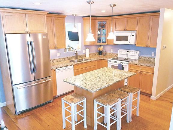 A well maintained L shaped 3 Bed ranch. This updated home features Cabico Maple kitchen cabinets with island, granite counters, pendant lights, recessed and under mount lighting, solid pine 6 panel interior doors, wide plank heart pine flooring and crown molding throughout main level area. A Morso squirrel wood stove sitting on a slate hearth provides alternative heat source and ambiance. The full walk out basement has a pantry, work shop, large 1/2 bath laundry room, family room set up for a large TV, office nook off the the family room, and a 200 amp service for future expansion if needed. All windows were replaced with Harvey Industries windows with grids. Almost everything has been replaced or renovated since 2006. The exterior features a large 2 level deck on left side for entertaining and a nice porch off the front entry. There is a 10x12 shed for lawn equipment and a large U shaped stone driveway with a ton of parking. This is one ranch home you don't want to miss!
