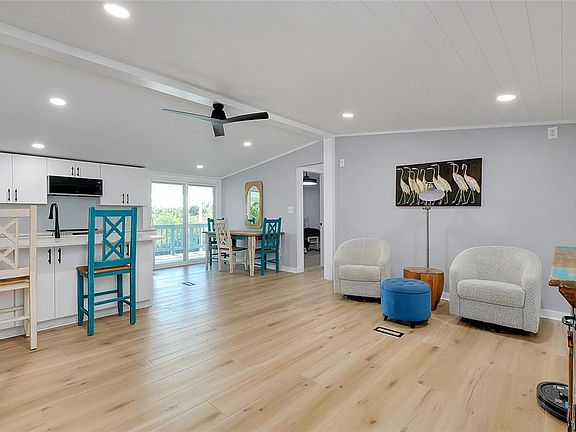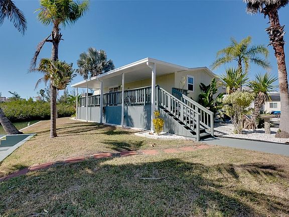 WATERFRONT, elevated home with oversized lot (.68 acres), surrounded on two sides by water. Move-in-ready Key West style paradise located just North of Venice Island on paved cul-de-sac. Tropical landscaping with beautiful, mature palms creating a private, secluded sanctuary. Nestled in a desirable 55+ HOA community, this canal-front home with 185' feet of concrete seawall offers direct boating access to the Intercoastal Waterway, allowing you to be enjoying the Gulf in 15 minutes. Property is already permitted for a boat lift and dock, transferable to new owner. Charming, historic downtown Venice is only a 10 minute walk away providing easy access to boutique stores, restaurants, the farmer's market, fun festivals, events and a multitude of parks. Venice Beach is under 2 miles away. Outdoor enthusiasts will love having the Legacy Trail and Venetian Walkway steps from their door, offering easy access to the area's natural beauty. Imagine launching your kayak and paddling through the mangrove lined beauty of Hatchett Creek or cruising the intracoastal waterways. Don't be surprised to see Snook, leaping Mullett, Manatee, Otters, Osprey, Herons and other wildlife from your elevated, shaded deck that runs the length of the home overlooking the water. Carport is large enough to accommodate two cars, boat or RV. Interior and exterior storage galore- including a 12 x 20' enclosed shed on elevated foundation with dual doors for wide entry. The immaculately renovated interior boasts a bright open kitchen with new LG stainless steel appliances, quartz countertops and Kraft-Maid cabinetry. Primary bedroom adjoins a nicely remodeled bath that features a new vanity with white quartz counter and tiled walk-in shower. 2 additional bedrooms share another bath that is new from top to bottom and has a tub for soaking. New Shiplap ceilings, luxury COREtec 10 mil plank flooring, modern lighting and freshened interior/exterior paint. Updated and elevated HVAC (with a 5 year parts and labor warranty), new electrical panel, and new FPL electric meter with underground wiring. You own the land, no lot rent, this home sustained no damage from the 2024 hurricane season. Your tropical paradise awaits you and your HOA approved pet.