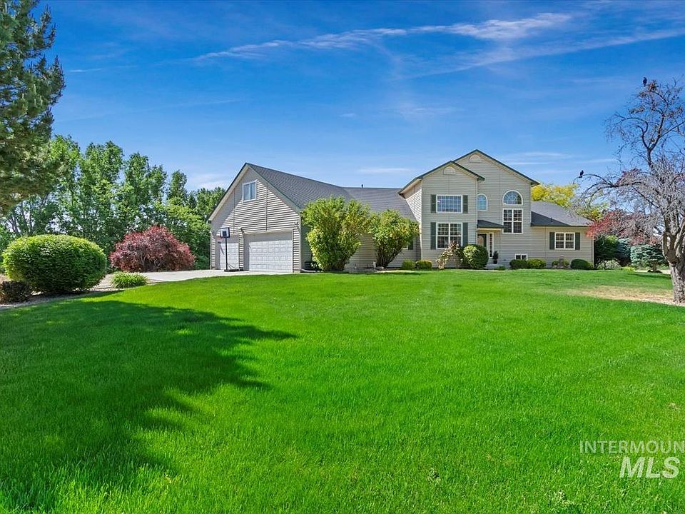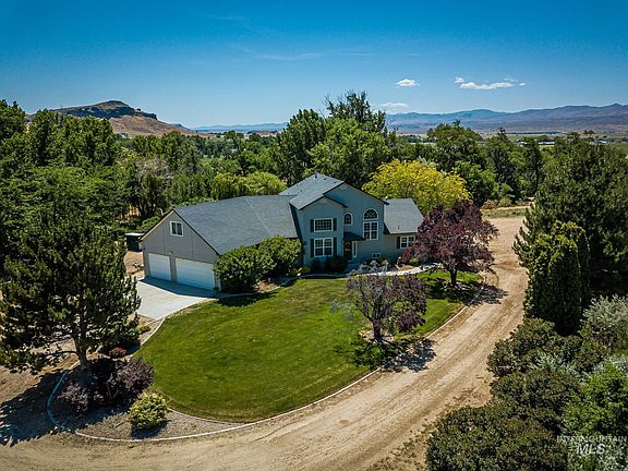 Natural beauty meets peaceful country living. Nestled at the end of a long private drive amidst tree-lined landscapes offering panoramic views, this custom-designed home rests on nearly 5 acres of scenic Idaho land. Spend your evenings witnessing the breathtaking sunsets enveloped in the serene sounds of nature while contemplating the endless possibilities to create your ideal homestead: build a shop or barn, raise livestock or cultivate gardens. Bright interior is bathed in natural light pouring through the picture windows featuring 2 master suites w/ 1 on the main level w/ private entrance & the 2nd nestled on the upper level complete with a private balcony. Main level offers a spacious kitchen with a generous island, perfect for entertaining, an office, laundry, & guest bath. The walkout basement expands the home's living space, offering a family room, game room, two guest bedrooms,full bath,separate multi purpose room & ample storage. Finished bonus room above the garage provides versatility & privacy.