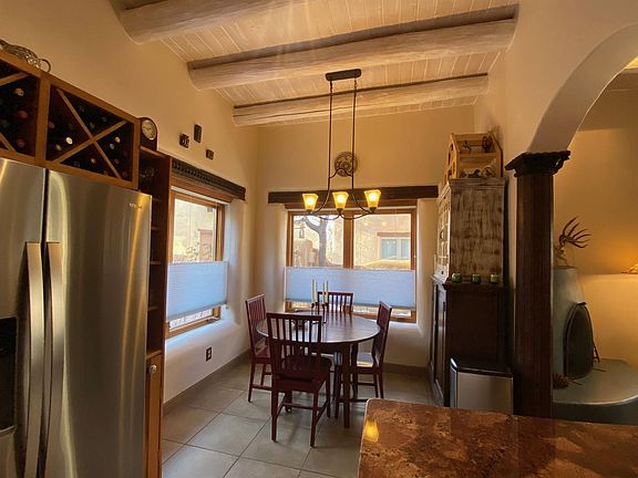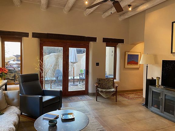 When you expect only the best, look no further! This exquisite adobe condominium combines fantastic heart-of-Taos location and refined architectural finishes throughout. A formal gated entry leads to a soaring foyer and the living room beyond. The well appointed kitchen includes a comfortable dining area. Smooth plaster walls and Vigas grace every room. A southwestern style fire place steals the show in the living room and glass doors expand the entertaining area outside to the walled courtyard patio. A private guest bedroom shares patio access with the living area. The guest bath features a deep walk in shower. The real showstopper of this fabulous home is the second level. A gracious stairway leads to a home office nook, the primary bedroom and a 700 square foot partially covered exterior patio. Unwind and entertain year round in front of the patio's large Kiva fireplace. There is a second private balcony accessed only via the spacious primary bedroom. The primary bath is spa like with jetted tub and separate walk-in shower. Ample closet and storage space and an attached one-car garage complete this ideal in-town true Taos condo.