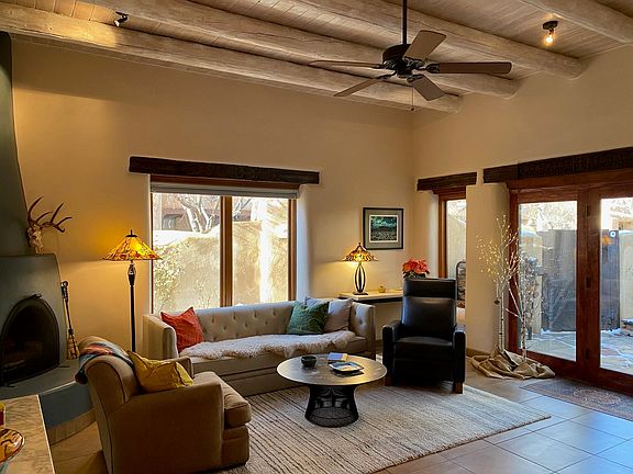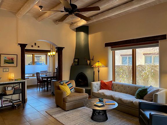 When you expect only the best, look no further! This exquisite adobe condominium combines fantastic heart-of-Taos location and refined architectural finishes throughout. A formal gated entry leads to a soaring foyer and the living room beyond. The well appointed kitchen includes a comfortable dining area. Smooth plaster walls and Vigas grace every room. A southwestern style fire place steals the show in the living room and glass doors expand the entertaining area outside to the walled courtyard patio. A private guest bedroom shares patio access with the living area. The guest bath features a deep walk in shower. The real showstopper of this fabulous home is the second level. A gracious stairway leads to a home office nook, the primary bedroom and a 700 square foot partially covered exterior patio. Unwind and entertain year round in front of the patio's large Kiva fireplace. There is a second private balcony accessed only via the spacious primary bedroom. The primary bath is spa like with jetted tub and separate walk-in shower. Ample closet and storage space and an attached one-car garage complete this ideal in-town true Taos condo.