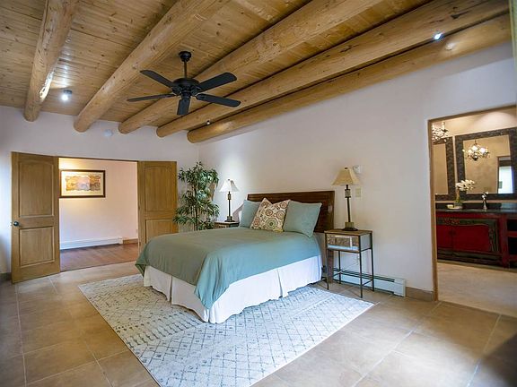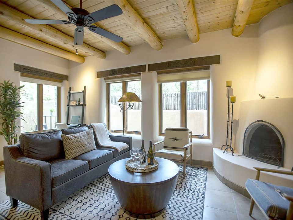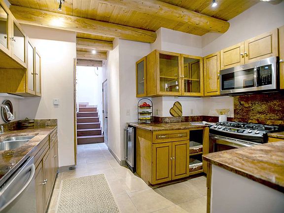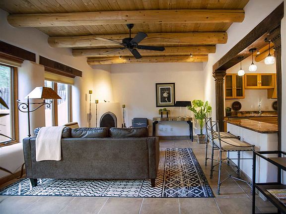 Live in an exquisite adobe condominium only steps from the center of town and minutes from the Taos Ski Valley. 408 Kit Carson is a boutique condominium development with only 9 homes, featuring old-world architectural details, expansive private courtyards and authentic adobe construction and design. Ancient wood doors welcome you to one of the largest private courtyards in the complex. Unit 5 is a 2-level home with a heated garage, a large bedroom and bathroom on each floor, a fully equipped kitchen with stainless steel appliances and granite countertops and a master bathroom with a large shower and a separate tub. A large deck off the master bedroom has an outdoor fireplace and a space for a hot tub. This enchanting home is at the perfect Taos address, directly across the street from the world-renowned El Monte Sagrado Resort and Spa and just a 10 minute stroll to the historic Taos Plaza.