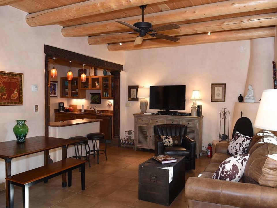 One of the boutique Los Rosales de Taos condominiums near Taos Plaza, with an enviable location on Kit Carson Road, affording you quick and convenient access to all the best things to see and do in Taos. The open floorplan of the Taos Villa #6 feels spacious, yet cozy and intimate at the same time. Seating areas are fluid, so you can gather close to the fireplace, spread out to watch the large screen TV, or socialize comfortably with others in the kitchen and dining areas. The upstairs Master suite (with King bed) has an ensuite bath with shower, and a separate jacuzzi bathtub. The second downstairs bedroom (with Queen bed) also has an ensuite bath with shower, and a walk-in closet. Additionally there is a sprawling deck (with a working kiva fireplace) off the Master suite. For outdoor cooking, you have sole access to a gas grill on your private deck.