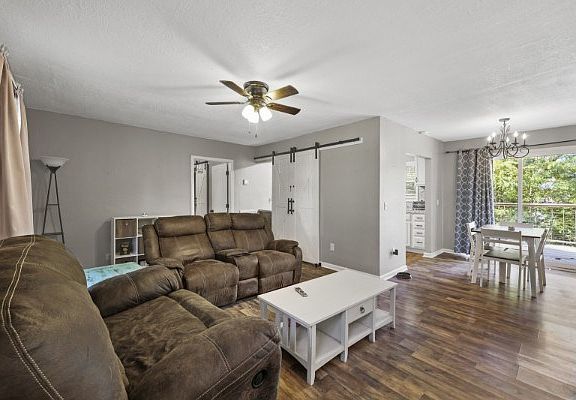 Mature treesStainless steel appliancesSpacious yardNatural lightWhite cabinetryStylish sliding barn doors