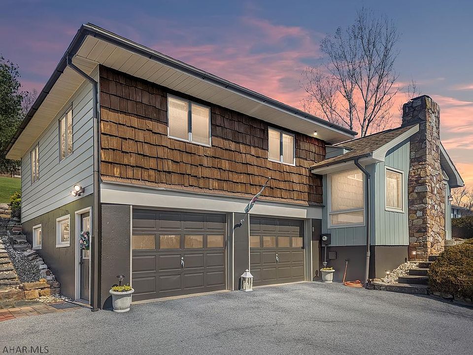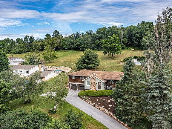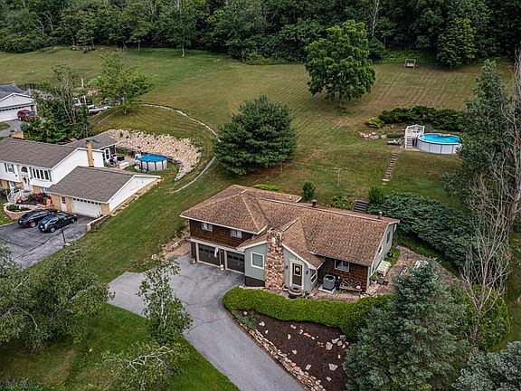 Gorgeous multi-level home with phenomenal views and spectacular amenities! 4 bedrooms, 2 full baths - including a master bedroom/bath. The living room has a cozy stone gas fireplace, a wood accent wall and vaulted ceilings highlighted with a stained glass style accent at the peak. The kitchen offers amazing views and a side patio where you can enjoy dinner al fresco on the large picnic table or your morning cup of coffee. There is also a spacious family room and a 4th bedroom that could be used as an office. Back deck has new boards and paint. From here, ascend the stairs to the above ground pool with mountain views. Further up, you'll find a swing where you can sit, relax and take in the scenery. Pellet stove, new central air, pool pump, drywalled 2 car garage/steel access door. 3D tour!
