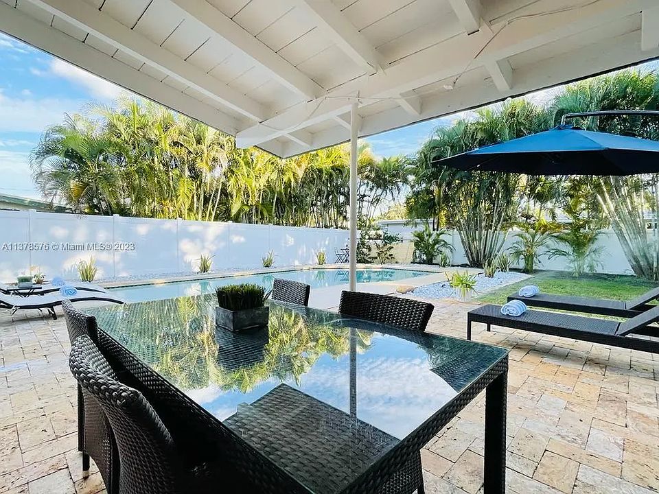 Gorgeous pool home with original vaulted wood beam ceilings and an open floor plan make this property a wonderful place to call home. 3 bed 1 bath. This tropical paradise features a beautiful heated swimming pool, BBQ and sitting area perfect to host events, new tropical landscaping, impact windows, renovated kitchen and bathroom, stainless steel appliances, pavers, covered patio and much more. Renovated street with bike lanes added. Landscaping and Pool Maintenance included in rent. Near Downtown Wilton Manors with great dining, nightlife, activities. Grocery stores nearby. Small commute to downtown Fort Lauderdale and beach.