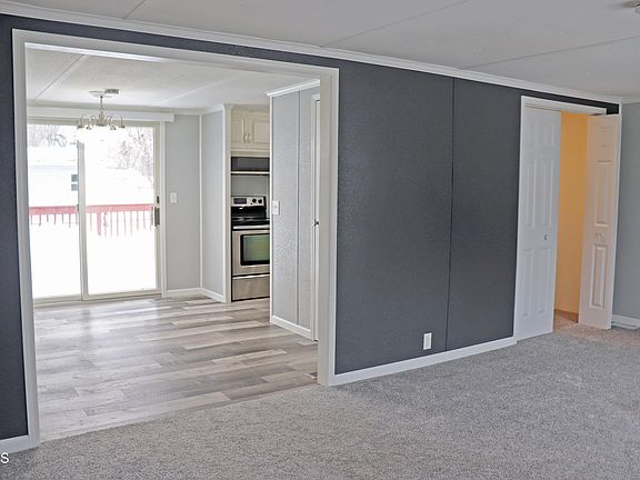 Come take a look at this beautiful double wide home in South Bismarck. Almost every square inch of this property has been updated. Vinyl plank flooring, carpet, doors, newer windows, lighting, and appliances have all been updated. The walls have been retextured and painted to reflect current trends. The main bath has a jetted tub with custom tile surround. This is a must see feature! The sun lit living room leads to the bright dining room with a view of the backyard through the new sliding doors. The kitchen is spacious and has new stainless steel appliances. Past the dining room you will find the laundry room, 3 bedrooms and 2 bathrooms, including a primary bedroom with walk-in closet and 1/2 bathroom. The exterior offers a deck that wraps all the way around the house and finishes at a large outdoor space perfect for grilling or summer entertaining. The fully fenced backyard is surrounded by mature trees. Finally take advantage of the oversized singe garage for all your storage needs. An option not available on all lots in the park. Buyers must get park approval. Call an agent to 'Address Your Future' today.