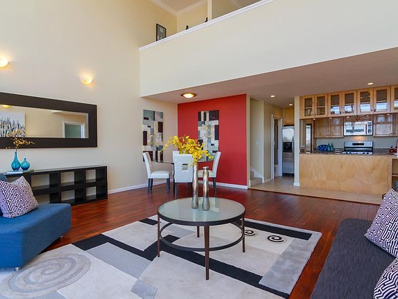 City chic in beautiful San Carlos hills and a rare offering! This property is a town home style condo in a small community of 9 buildings, each consists of 4 units. This east facing unit boasts an open living area on the main level featuring: dramatic, soaring ceiling in the living room, bay views framed in a wall of expansive floor-to-ceiling windows, engineered wood floors and a remodeled kitchen. The generous pantry has potential for a powder room or private laundry. Two spacious bedrooms on the second level, each with its own deck/patio. A remodeled full bath with dual sinks, tiled surrounds and floors. Views can be enjoyed from both levels. The loft bedroom can also be a family room or office. Easy access to public transport with new bus route on Melendy to San Carlos CalTrain station, minutes to Highlands Park. A great starter in a coveted community with top rated school district. Heather Elementary, Terra Linda Middle and Carlmont High Schools.