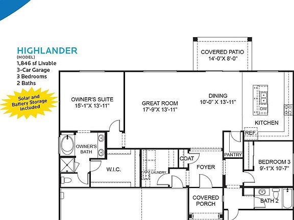 The Highlander at The Estates is beautifully designed for energy efficiency, comfort, and longevity. Every detail of this 1,846 square foot floor plan has been thoughtfully considered. The spacious Great Room is perfect for family time and connects to the patio with a variety of sliding door options. There are plenty of design options to make Highlander your own, from a ideally appointed gourmet kitchen, to the tile in the generous owner's bath. The Highlander starts at 1,846 square feet, 3 bedrooms, 2 baths, and with a 3 car garage. This Highlander floor plan comes with solar and sonnen energy storage standard too, meaning near zero energy bills!