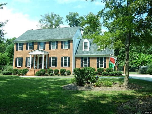 WOW PRICE REDUCTION!!! Classic and traditional home in the ORIGINAL section of Rivers Bend on a quiet cul-de-sac. 4 bedrooms and 3 1/2 baths!! Attention to details with Concrete drive, stamped concrete walkway and porch and ornamental fencing that surrounds professionally landscaped and very private grounds with irrigation front and back. Large fire pit is currently a bricked sandbox! This luxury home has TWO Master Suites both with Ensuites and huge walk in closets! 2nd floor laundry room. Hardwood floors throughout the home and a ceramic tiled eat in kitchen. Formal Living and Dining rooms and a wonderful Family room w French doors leading to a huge screened in porch perfect for the Virginia autumn days. 30 year 3 dimensional roof, Convenient to Rt 10, I-95 and I-295. An absolute gem in the heart of Chester's sought after Rivers Bend!