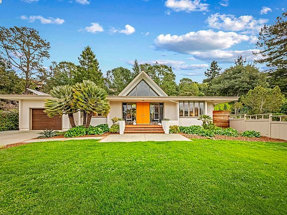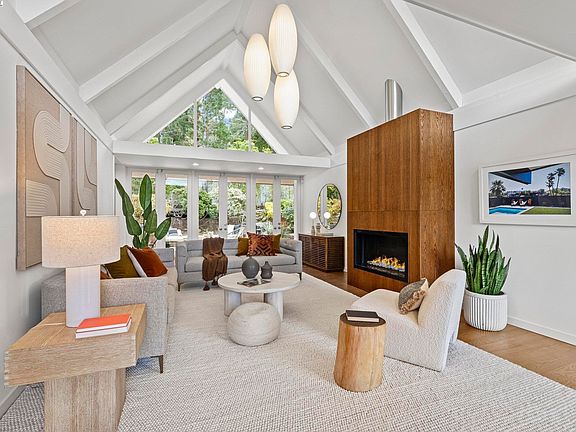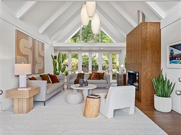 Mid-Century Modern Elegance in Peacock Gap! This stunningly remodeled mid-century modern home is a true trophy property in the coveted Peacock Gap neighborhood. Designed for both luxury and comfort, the open-concept layout showcases soaring ceilings, sleek lines, and rich hardwood floors, all illuminated by designer lighting. At the heart of the home is a chef’s dream kitchen, featuring an oversized island with pristine white composite counters, a Sub-Zero refrigerator, and a built-in banquette. Two ensuite bedrooms provide ultimate privacy, including a primary suite with a spacious walk-in closet. Modern upgrades including custom electric blinds, smart lighting, solar electrical, a newer A/C unit, furnace updates, and a newer roof. The landscaped front yard is framed by mature palms, while the backyard blends hardscaped brick, raised decking, and a serene Japanese-inspired garden. Ideally located just moments from waterfront trails, Andy’s Market, Peacock Gap Golf Club, China Camp Park and McNears Beach, this home offers the perfect balance of style, function, and convenience.