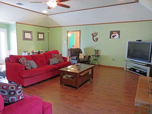 Nice 4/2 country home minutes from town on 2 acres. This move in ready home offers split bedroom floor plan, spacious island kitchen w/window seat windows, stainless appliances, large great room with high ceiling and wood burning fire place. Master bedroom suite boasts large walk-in closet & beautiful granite counter in the bathroom. Bedrooms are good size with ample closet space. Small shop & detached storage/garage have electricity. Relax on your back patio and enjoy the peaceful view & quiet country life.