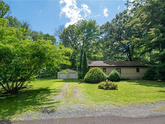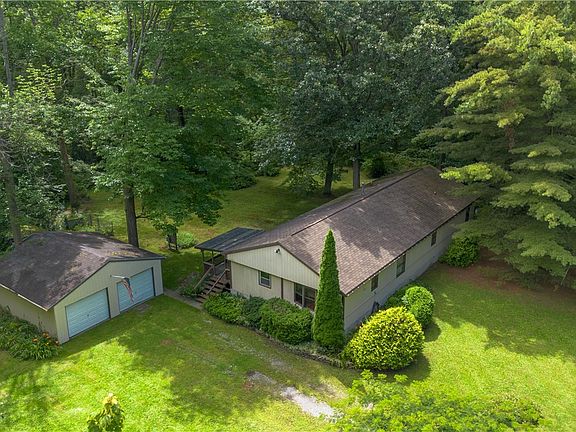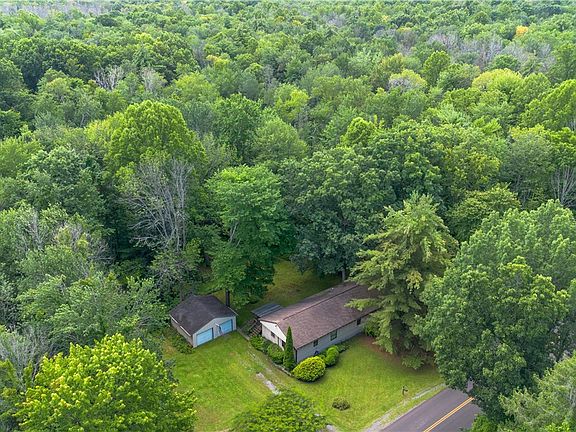 Looking for privacy? This spacious 4-5 Bedroom, 2 full bath ranch home sits on just under an acre of land surrounded by woods, with a detached two car garage! Enjoy the private setting, minutes into Waterloo or Geneva, Seneca Lake, Big Oak Golf course & more. This spacious ranch style property offers a nice open floor-plan with plenty of bedroom space! Entering from the covered back porch, a laundry room/foyer space welcomes you in, moving straight into the large eat-in kitchen space with breakfast bar and plenty of natural light. A large open formal dining room and living room space leads to the bedroom hallway, with 4 spacious bedrooms and 2 full bathrooms, plus a bonus room/5th bedroom. Property will need TLC, being sold as-is, where is.