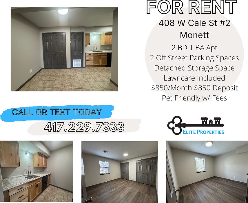 2 bedroom, 1 bathroom 1st floor apartment in Monett. Newly remodeled. Includes lawncare, 2 off-street parking spaces, and large detached garage storage space. Tenant responsible for all utilities. Available February 1. Message for showing instructions or link for application. No prior evictions or felonies. All Elite Properties applications are good for 90 days for any properties within your approval amount.