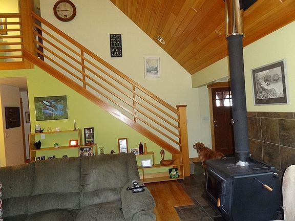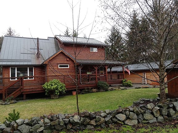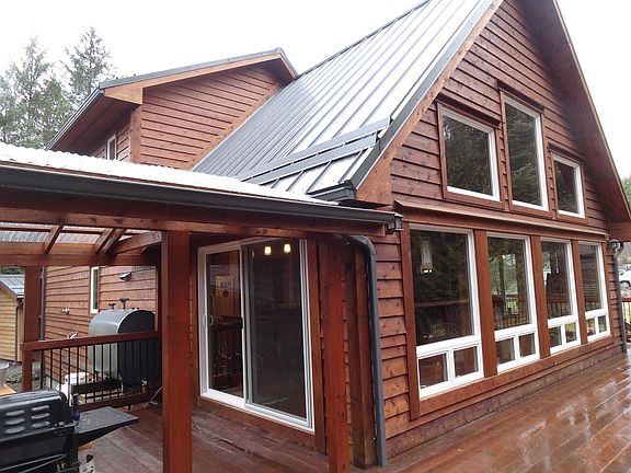 Custom-built, 5-star plus energy-rated home constructed in 2010 on 0.28-acre lot overlooking Deer Creek. Locally harvested and milled wood (Alaska yellow cedar, western red cedar, western hemlock) used for deck structure and decking, railings, siding, trim (interior and exterior), flooring, vaulted ceiling, and timber framed wood shed and workshop/weight room. * Cedar lap siding with grey metal roof and seamless aluminum gutters * Landscaped yard 3 bedrooms * Master bedroom downstairs o Walk-in closet with custom shelving o Wood flooring * 2 bedrooms and loft upstairs o carpeted 2 full bathrooms * 2 vessel sinks in each * Vinyl flooring Open floor plan Kitchen * Granite countertops with tile backsplash * Center island * French door refrigerator, gas range, microwave, dishwasher * Wood flooring Pantry Mudroom/utility room * Front-loading washing machine and gas dryer * Toyotomi on-demand hot water heater * Vinyl flooring * Coat Closet * Utility sink * Cabinets above washer/dryer Entryway * Tile flooring * Coat closet * Custom bench Living room * Open to kitchen and dining room * Vaulted T&G wood ceiling * Wall of windows overlooking deer creek * Wood flooring Dining Room * Wood flooring Whole-house water filter Toyotomi diesel heater BlazeKing Princess Woodstove (with catalytic converter and blower) Backup electric wall heaters in bathrooms, bedrooms, and mudroom Wraparound cedar deck – 629 sq.ft. open deck and 502 sq. ft. covered porch on front and off dining room 3 detached buildings * Gardening shed * 979 sq. ft. fully-insulated timber frame workshop & weight room * 21’ x 12’ Timber frame woodshed (filled with firewood) Additional items included: Furniture * Sectional couch with 2 built-in recliners * 2 reclining LR chairs * Dining room table with 6 chairs (bar height) * 4 barstools for kitchen island * Captains bed (queen sized) * Queen and Full sized beds (in upstairs bedrooms) * Dresser with mirror * Shelves * Custom wood desk (loft) * Desk chair * Picnic table 2 chest freezers Additional French door refrigerator in workshop 2 Flat-screened TV’s in workshop * 14-inch and 27-inch Weight bench and weight set Husqvarna lawn mower Troy-Bilt track snow blower Stihl chain saw Honda GTX270 pressure washer Briggs & Stratton 7000 watt generator