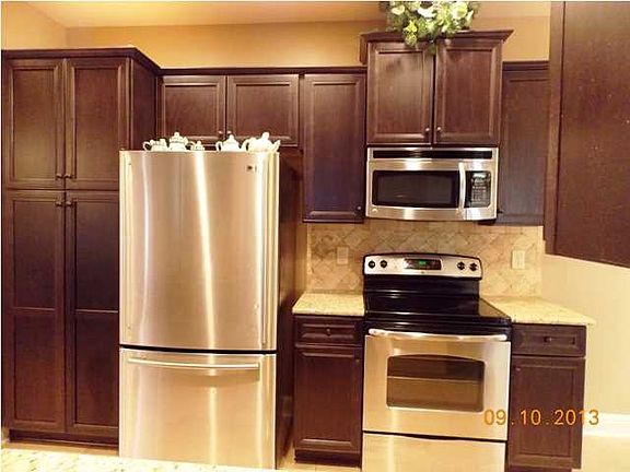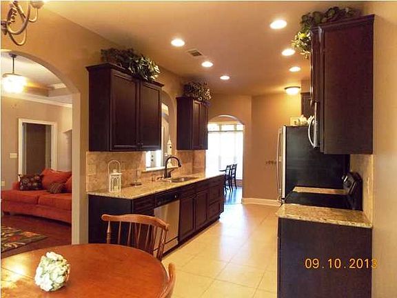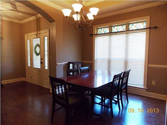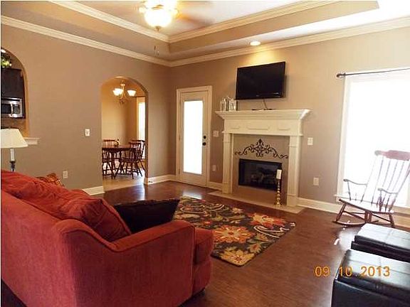 Enter this great open floor plan with formal dining room as you come into the house. Arched openings into kitchen and den. Gas logs, hard wood floors, granite counter tops, arched openings, loads of black cabinetry and pantry, stainless appliances. Master suite with nice bedroom; bathroom with soaking tub and separate shower, double vanities, walk in closet on one side of the family area and other 2 bedrooms and hall bath on the other. Laundry room opens to the garage. Covered back porch overlooks large back yard and into wooded area behind house. Plenty of privacy for enjoying your morning coffee.