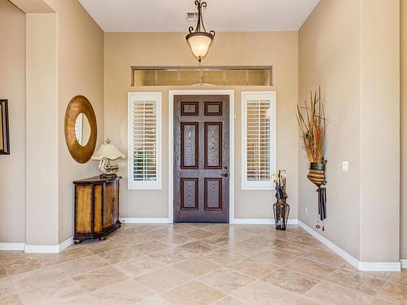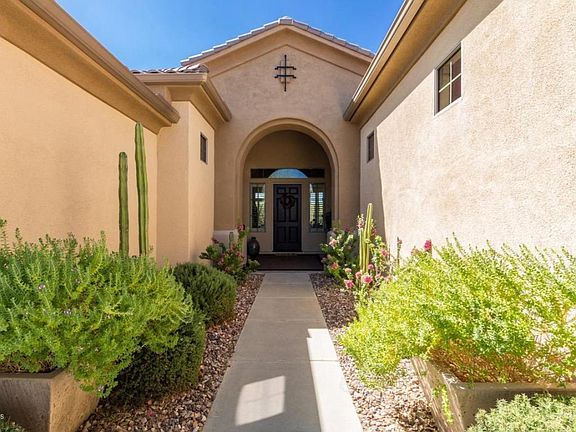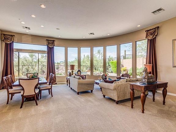 One of the most private lots in all of Anthem Country Club! The original owners of this 3 bedroom, 3 1/2 bath home with a den, have extended the indoor living to the outdoors with their meticulous attention to detail and multiple outdoor entertaining spaces. The breathtaking views of this home greet you the moment you enter this home and look out to the pool and beyond! This Castile model sits at a distance to the tee box of #8 on the Ironwood golf course and offers a split floor plan concept. The master suite in the north wing of the home comes with a sliding door, allowing you to fall asleep to the soothing sounds of the pool's waterfall. Step out of the master to your private covered patio and enjoy the views to the pool, spa and mountains. To the left of the pool is a fire pit