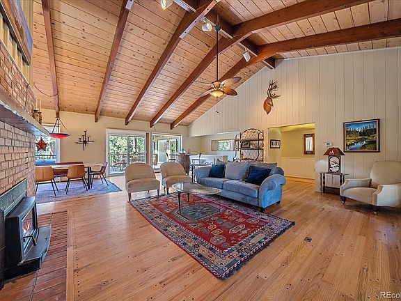 Live in the Heart of Evergreen with this stunning mid-century modern ranch nestled on a serene park-like setting. This home offers desirable main-level living and cathedral ceilings that add a touch of grandeur to the open-concept floor plan, making it ideal for entertaining. A lovely double-sided fireplace serves as the focal point of the spacious great room, creating a warm and inviting atmosphere. Abundant windows capture breathtaking sunsets to the west while providing easy access to the 830+-square-foot deck and gentle lot from the kitchen, great room and the primary suite. The primary suite on the main level features a beautifully remodeled bath with a walk-in shower and double sinks. This home has been meticulously maintained and features a new roof installed in 2023, along with a new high-efficiency boiler installed in April 2024. Additionally, it offers epoxy garage floors, a hot tub, a generator, and a private guest retreat on the lower level, including amenities such as a private bedroom with mini-fridge and sink, a full bath, and a family room with a cozy wood-burning fireplace. Enjoy abundant sunshine year-round, with the circular asphalt driveway ensuring quick snowmelt during winter months. With several Jeffco Open Space Parks and Evergreen Lake just minutes away, outdoor enthusiasts will delight in the endless hiking and mountain biking opportunities right at their doorstep. Conveniently located near schools, shopping, churches, and restaurants, this property also offers easy access to I-70 for commuting to Denver or exploring the picturesque mountains to the west.